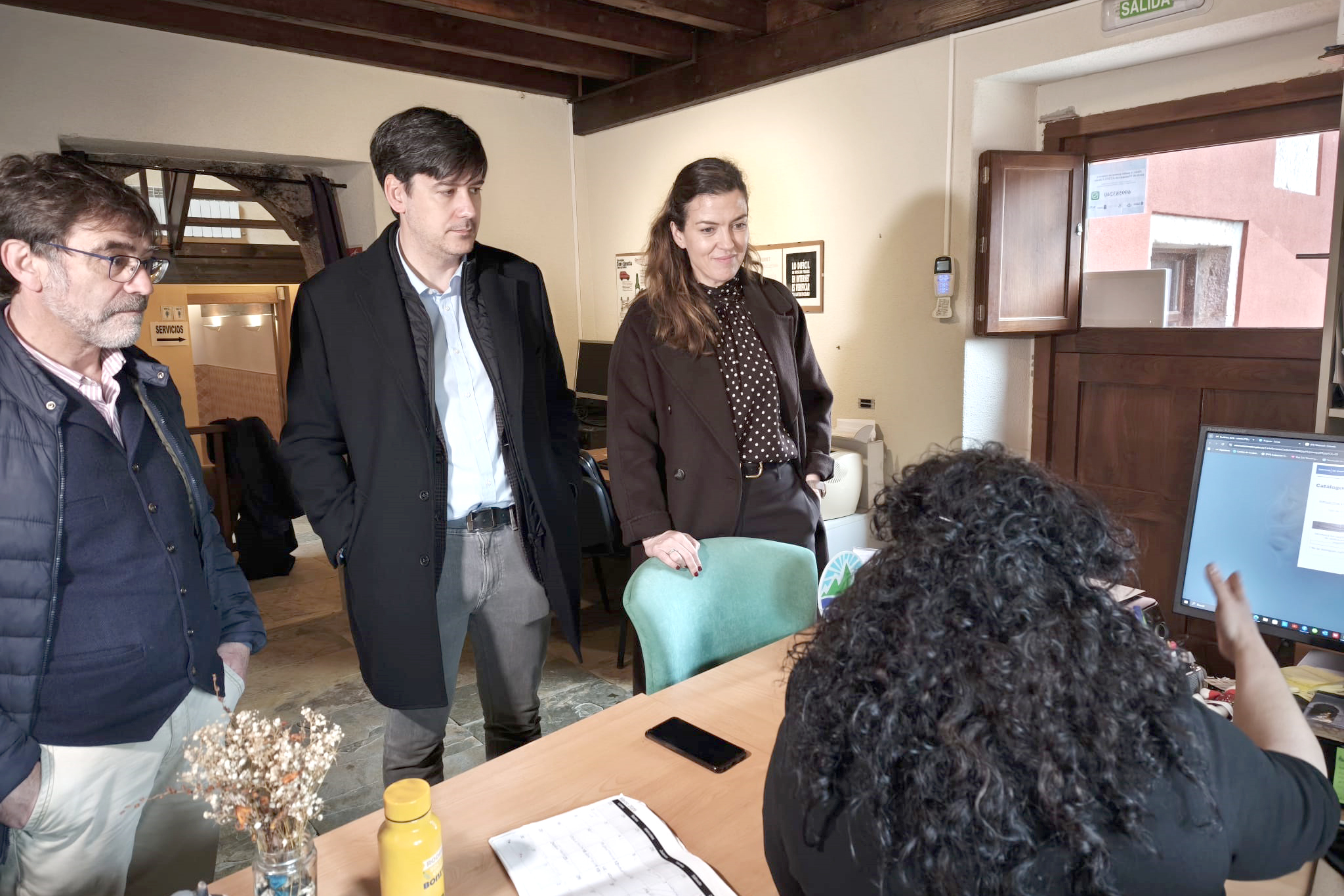 El consejero de Ciencia, Industria y Empleo, Borja Sánchez, y la directora del Sepepa, Begoña López, y el alcalde de Cabrales, José Sánchez Díaz, visitaron ayer el telecentro de Carreña, en Cabrales, que presta servicios de atención y apoyo a las personas que precisan información o realización de trámites sobre formación o empleo.